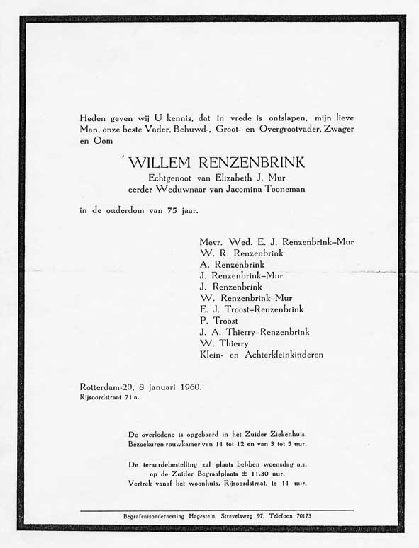 16 Elisabeth Jochemina Mur 17 Willem Renzenbrink 18 Willem Renzenbrink (1937) 19 Trouwfoto Willem en Lies met Bets en Mientje 20 rouwkaart Willem Renzenbrink2 Elizabeth Jochemina (Lies) Mur [1.1.2] (afb. 16), geboren op 28-07-1891 in Utrecht. Lies is overleden op 18-02-1984 in Huis ter Heide, 92 jaar oud. Lies trouwde, 45 jaar oud, op 05-05-1937 in Rotterdam met Willem Renzenbrink (afb. 17 t/m 20), 53 jaar oud. Willem is geboren op 03-05-1884 in Nederhorst den Berg, zoon van Rijk Renzenbrink en Christina Elisabeth Kroese. Willem is overleden op 08-01-1960 in Rotterdam, 75 jaar oud. Willem is weduwnaar van Jacomina (Mien(tje)) Tooneman (1880-1931), met wie hij trouwde op 20-03-1907 in Rotterdam. Willem begon eerder een relatie omstreeks 1923 in Rotterdam met N.N. van der Zande(n).