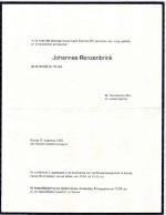 37 Johanna 38 Albert Renzenbrink 39 Albert Renzenbrink en Johanna Mur 40 rouwkaart Albertus Renzenbrink7 Johanna (Jo) Mur [1.1.7] (afb. 37), geboren op 26-04-1903 in Utrecht. Jo is overleden op 25-02-1985 in Gouda, 81 jaar oud. Zij is begraven op 28-02-1985 in Gouda. Jo trouwde, 34 jaar oud, op 14-04-1938 in Rotterdam met Albertus (Albert) Renzenbrink (afb. 38 t/m 40), 28 jaar oud. Albert is geboren op 09-07-1909 in Rotterdam, zoon van Willem Renzenbrink en Jacomina (Mien(tje)) Tooneman. Albert is overleden op 19-11-1998 in Gouda, 89 jaar oud. Hij is begraven op 25-11-1998 in Gouda.