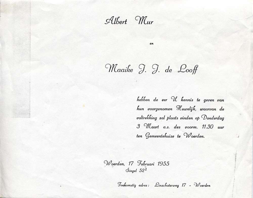 100 Gezin Wijnand Teunis 101 rouwadv. Wijnand Teunis Mur 102 Wijnand Teunis Mur en Jannetje de Looff 103 rouwkaart-Jannie-de-Looff1.7.1.3 Wijnand Teunis Mur (afb. 100 en 101) is geboren op 17-02-1929 in Bodegraven, zoon van Gijsbertus Mur (zie 1.7.1) en Janna Verweij. Wijnand is overleden op 23-04-1993 in Beverwijk, 64 jaar oud. Wijnand trouwde, 23 jaar oud, op 17-05-1952 met Jannetje Maaike Johanna (Jannie) de Looff (afb. 102 en 103), 22 jaar oud. Jannie is geboren op 02-09-1929 in Wardt, NRW, Duitsland. Jannie is overleden op 03-08-2008 in Beverwijk, 78 jaar oud.